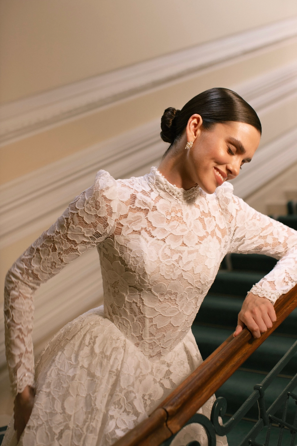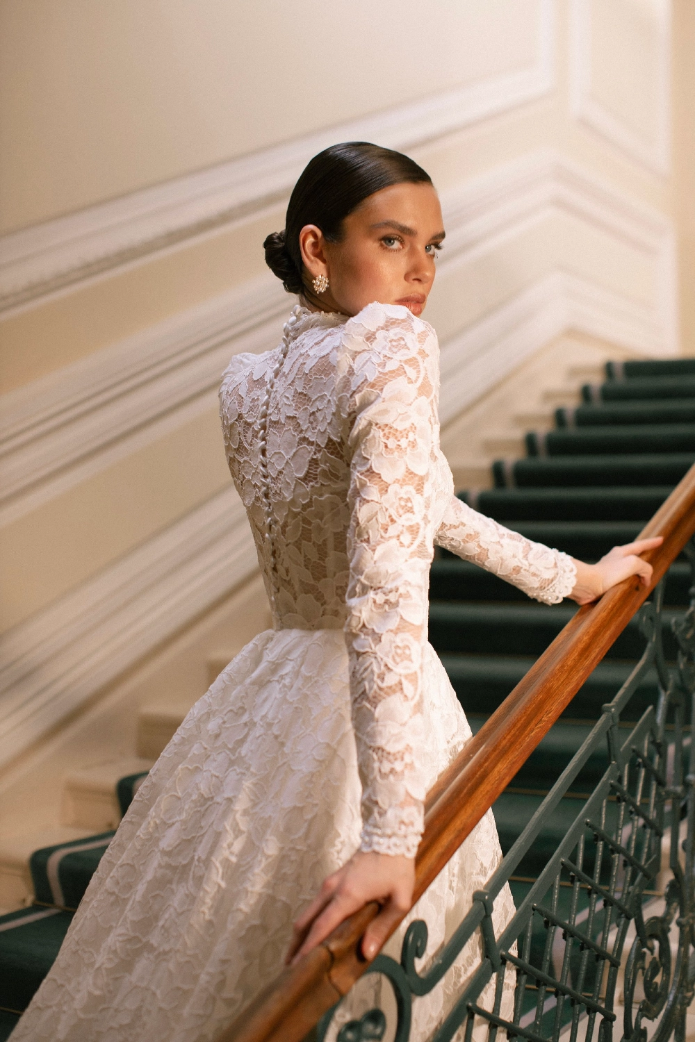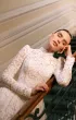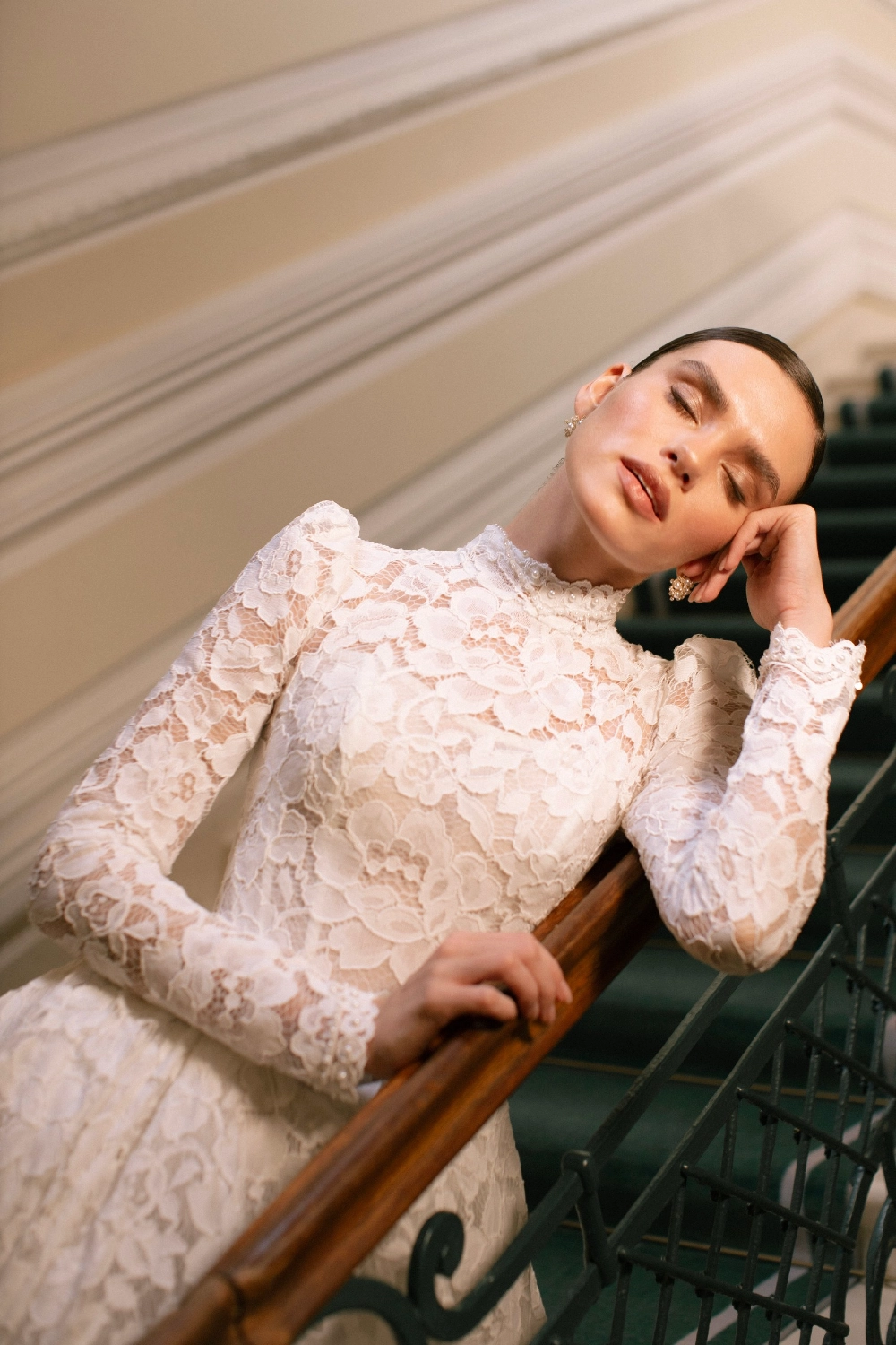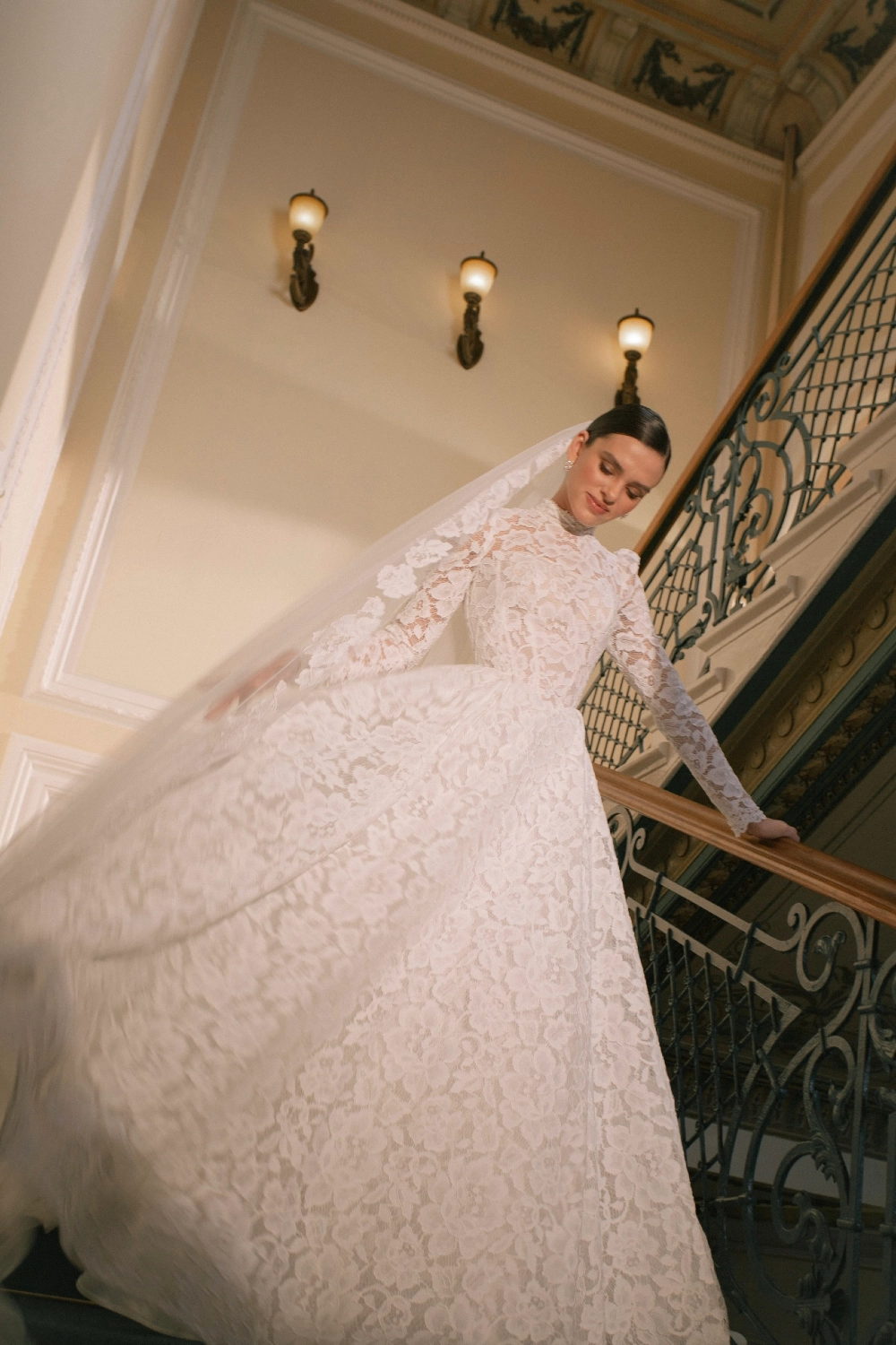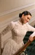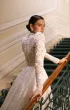 Элегантное свадебное платье А-силуэта с акцентом на корсет и многослойную юбку со шлейфом. Лиф из корсетной основы украшен воздушной майкой из кордового кружева, дополненной матовой сеткой. Фигурная линия талии в форме мыса подчёркивает изящество силуэта, а открытая шнуровка на спинке делает посадку выразительной. Узкие рукава из кружева с лёгкой сборкой и высоким воротником-стойкой расшиты пайетками и бусинами. Юбка из кордового кружева, микадо и фатина собрана в глубокие складки, придавая платью торжественный объём. Дополнительный акцент создают фистоны по низу. Возможны вариации корсета в молочном или телесном оттенке.