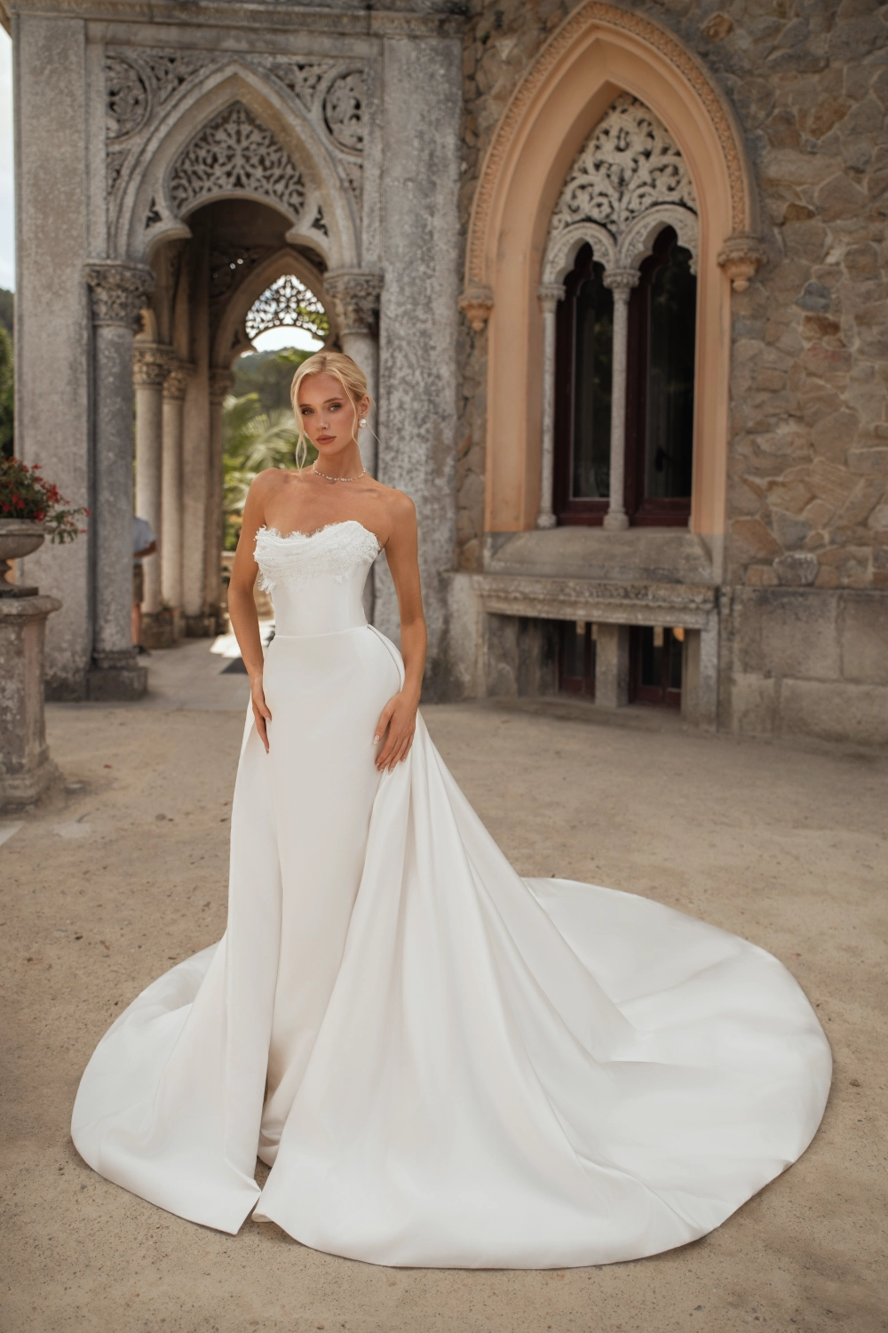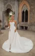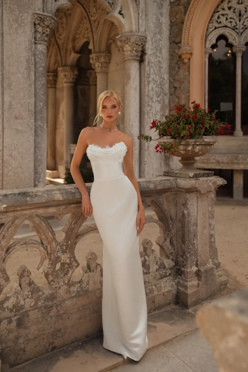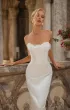 Элегантный свадебный комплект силуэта «русалка» с утончённой посадкой и акцентом на детали. Корсет на атласной основе с открытой шнуровкой украшен кружевом, пришитым вручную. Юбка облегающего кроя подчёркивает фигуру, а съёмный атласный шлейф на крючках добавляет торжественности и лёгкости движения. Возможные изменения: внутренняя шнуровка, съёмные рукава или крылышки.