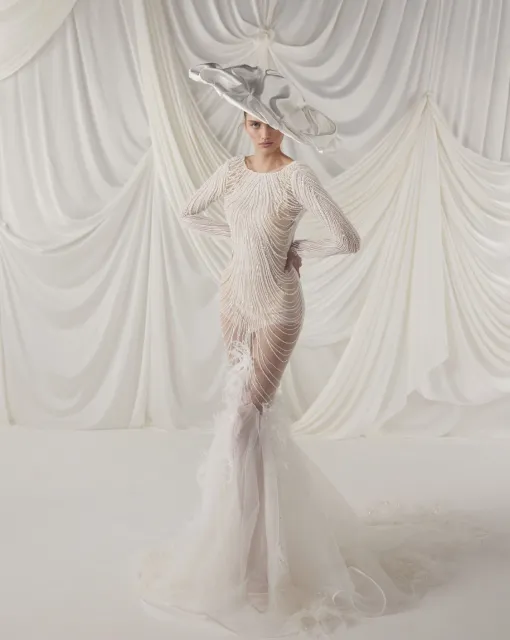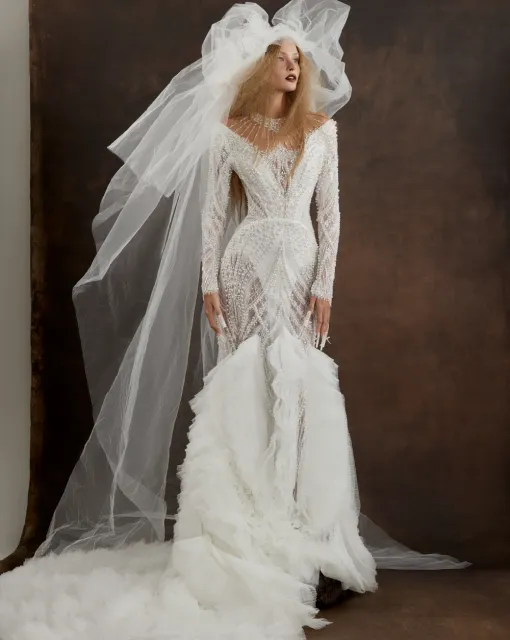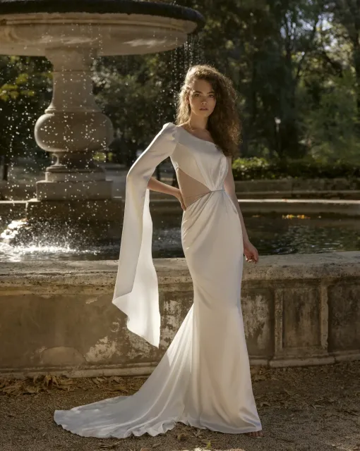 Свадебное платье А-силуэта с корсетом и глубоким V-образным вырезом. Тонкие бретели и узкий пояс на талии создают изящный силуэт, а многослойная юбка с расклешением и молнией в юбке завершает этот утонченный образ.