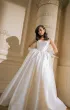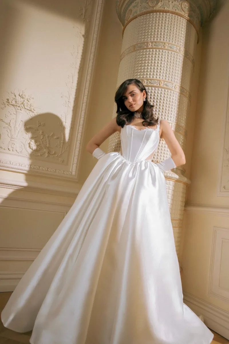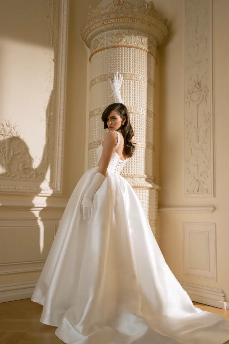 Пышное платье силуэта «принцесса», в котором каждая деталь напоминает о королевском стиле. Корсет с глубоким декольте и миндалевидными чашками украшен бисерной вышивкой, плавно переходящей на бретели. Фигурная линия талии с мысом подчёркивает стройность, а открытая шнуровка на спинке делает образ утончённым. Объёмная юбка со шлейфом собрана в густые складки и дополнена клиньями, которые придают лёгкость движению. В боковых швах скрыты карманы, а съёмная баска усиливает пышность подола. Возможен вариант с полностью закрытым корсетом для классического образа.
