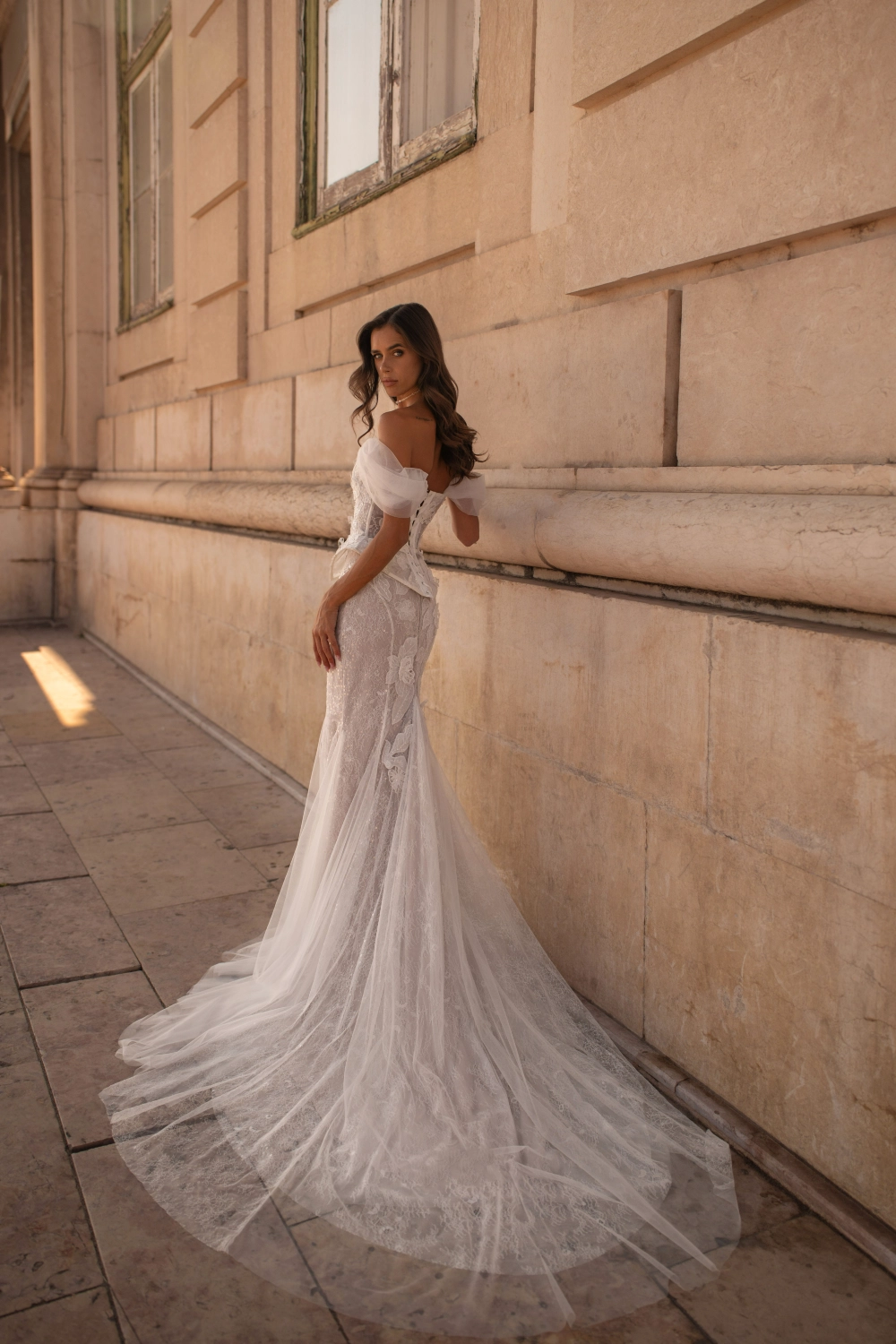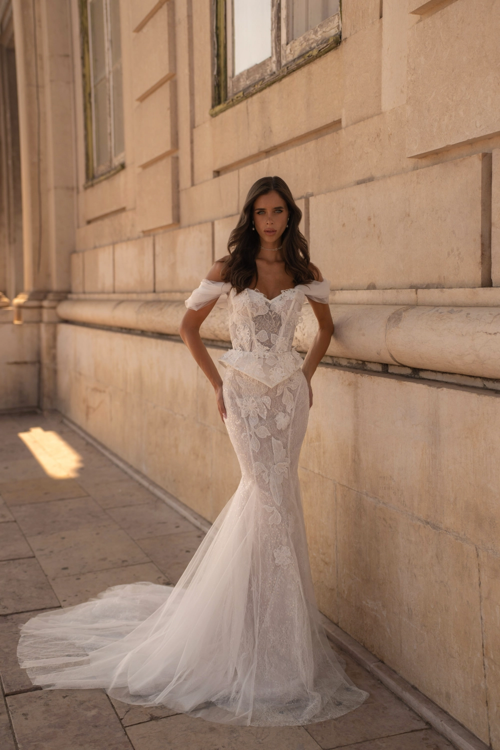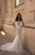 Свадебный комплект с юбкой силуэта «рыбка» — эффектное сочетание чувственности и изящества. Корсет идентичен модели ORID: скульптурный, с декольте в форме сердца, покрытый расшитым шантильи, пайетками и объёмными цветами. Юбка «рыбка» на телесной основе, декорированная двумя видами кружева, плотно облегает фигуру и расширяется от колен клиньями, переходя в аккуратный шлейф. Дополняется съёмными бретелями и лёгким шарфом с декором.
