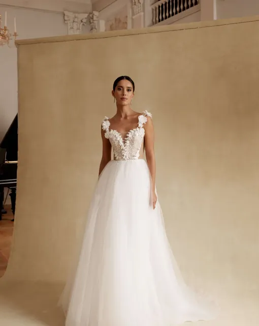 Мини-платье с выразительным декором и трансформируемыми элементами. Корсет с расшитыми лепестками и лентой с жемчугом. Юбка-буф выполнена из ткани с 3D розами. Дополнительно: съёмный шлейф и широкий пояс из атласа.