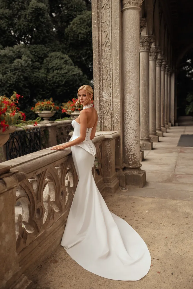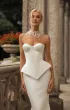 Утончённый свадебный комплект А-силуэта с удлинённым корсетом. Баска и плотные чашки формируют изящную линию талии, а бисерная расшивка добавляет блеска. Юбка из атласа и фатина с лёгким разрезом создаёт динамичный, лёгкий силуэт. Возможные изменения: внутренняя шнуровка, отсутствие декора, замена ткани на микадо лимонного оттенка.