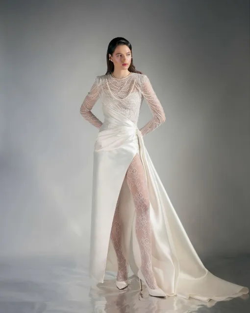 Плавные линии, жемчужные капли и прилегающий силуэт. Корсет украшен съёмной звездой и нитями жемчуга, подчёркивающими декольте. Длинные рукава и рельефная юбка завершают образ изысканным шлейфом.