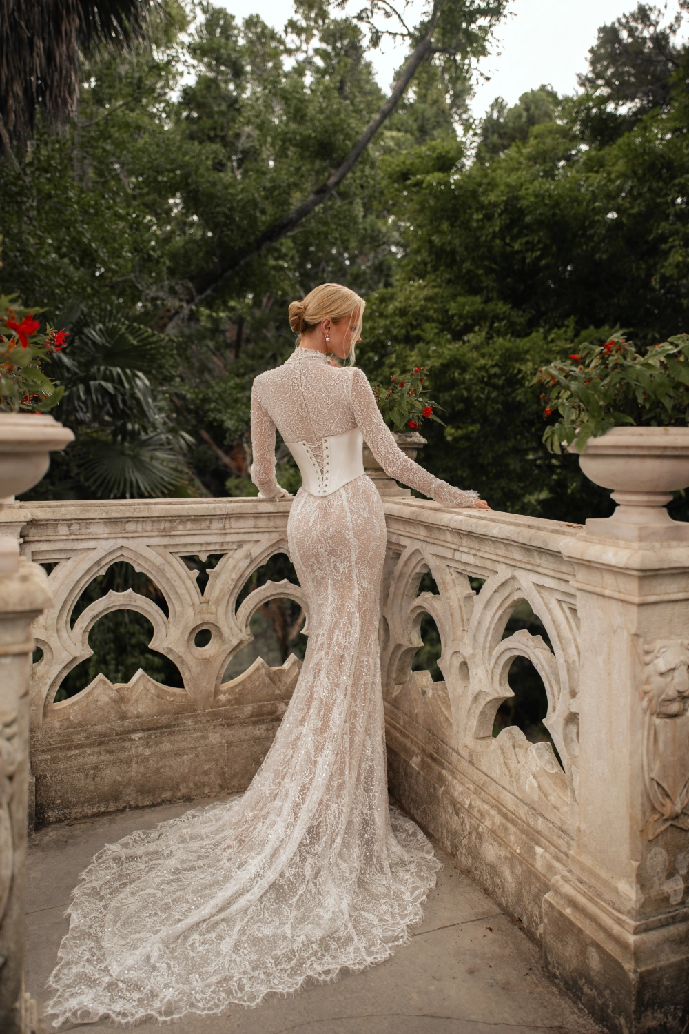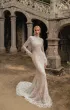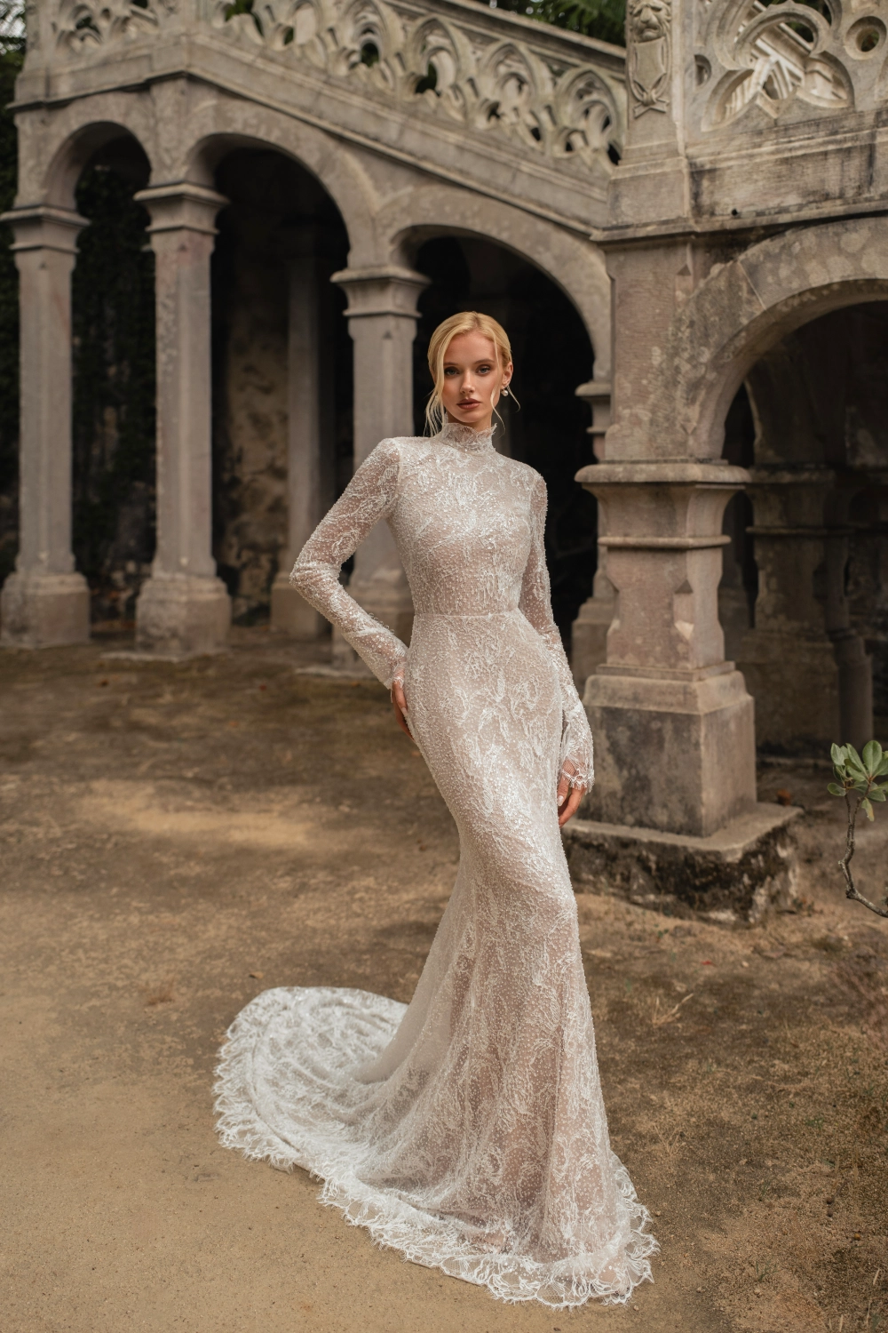 Элегантное платье «русалка» в закрытом исполнении с изысканными деталями. Майка из пудрового крепа с узкими рукавами и воротником-стойкой создаёт гармоничный силуэт. Юбка-«рыбка» с длинным шлейфом подчеркивает фигуру, сочетая строгость и женственность. Возможные изменения: исполнение на молочной подкладке.