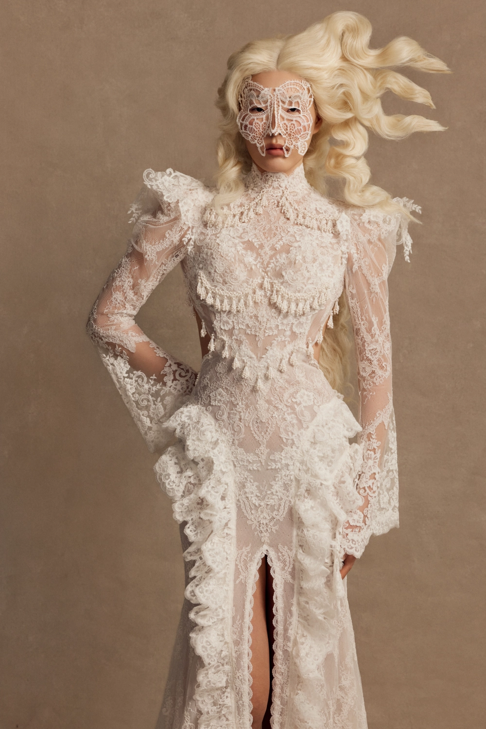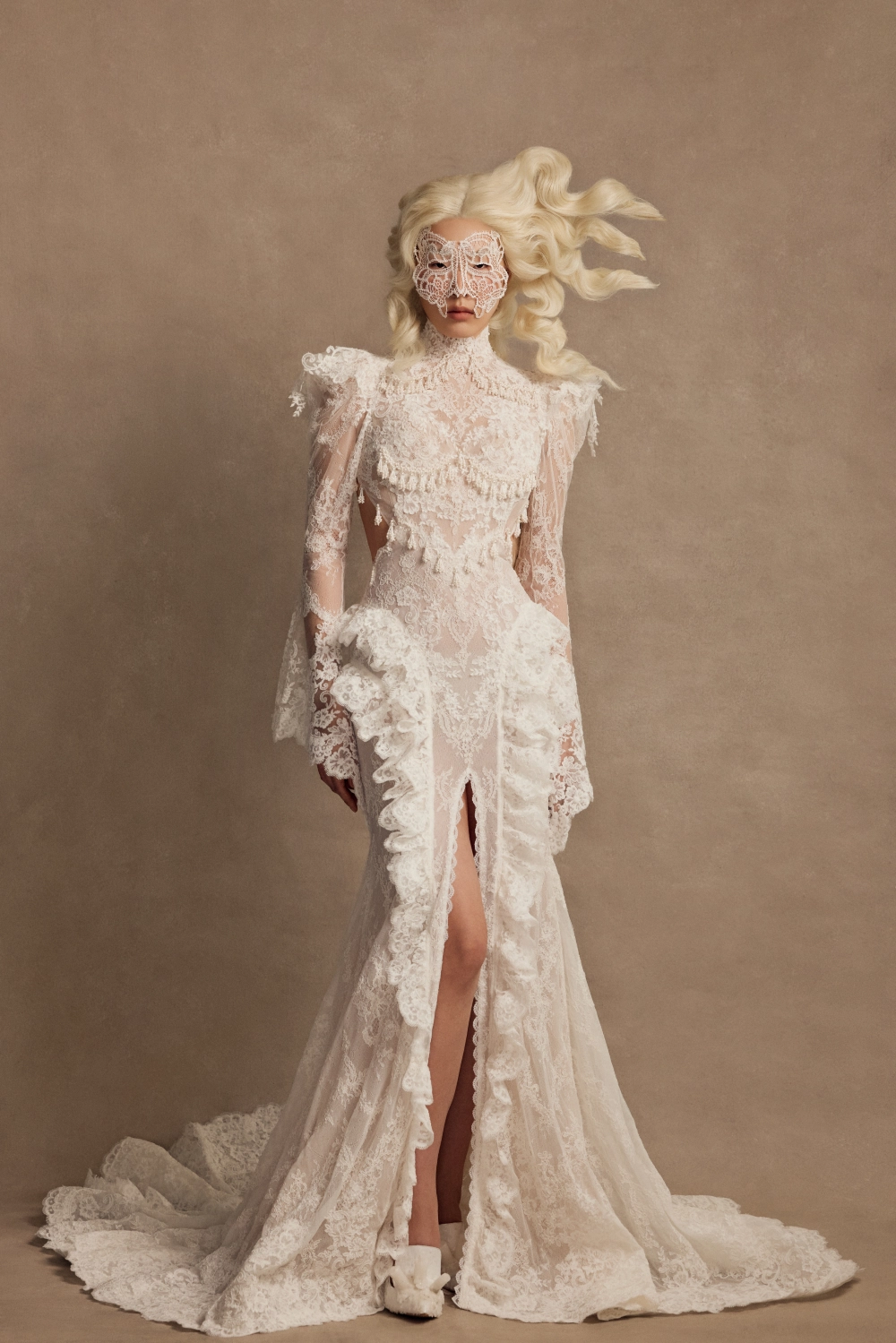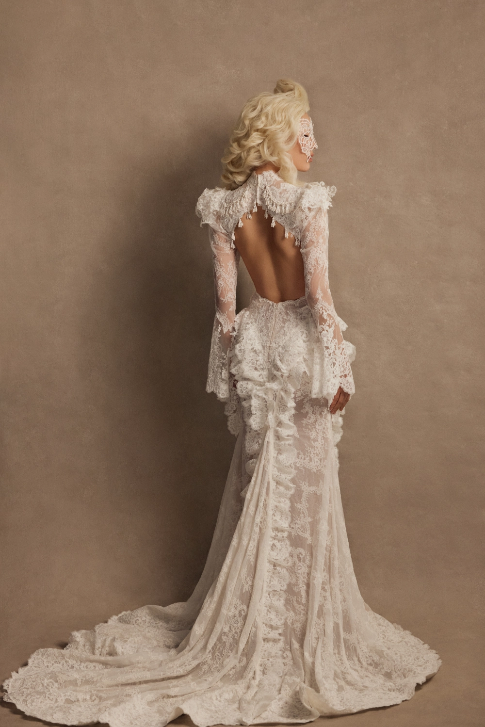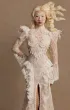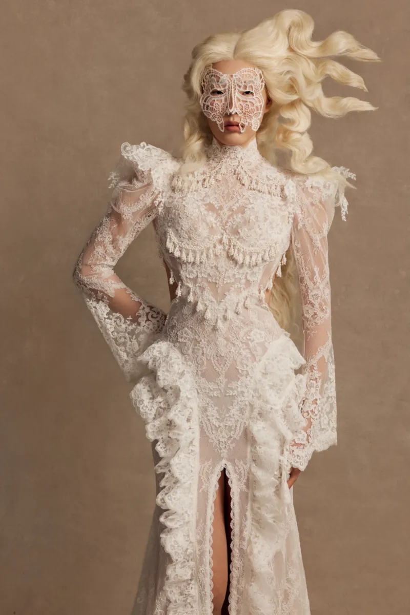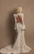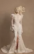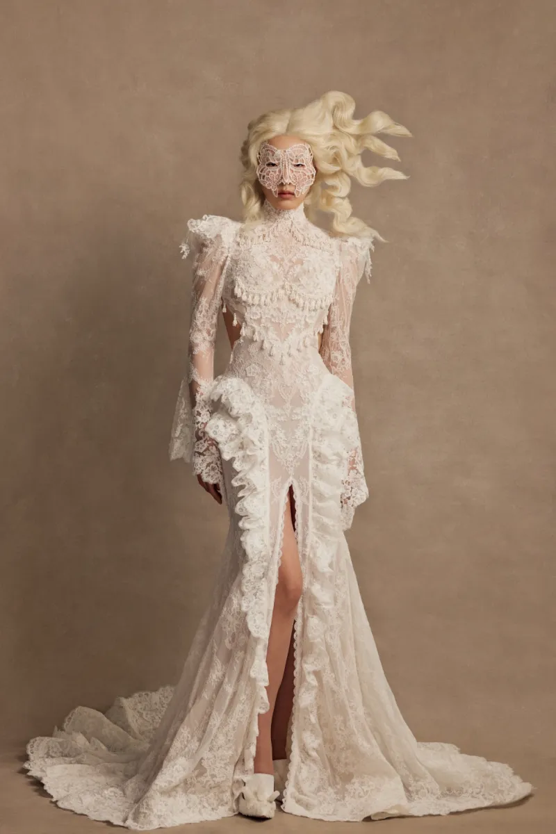 Эффектное свадебное платье силуэта «рыбка» с открытой спиной и высоким разрезом по юбке. Верх состоит из полупрозрачного корсета с мягкими чашками и кружевной майки с воротником-стойкой и длинными расклёшенными рукавами. Декор выполнен вручную — бисерная вышивка и плетение из бусин. Юбка со шлейфом выполнена из сетки и кордового кружева, украшена воланами и кружевной тесьмой по линии разреза. Возможны вариации: платье без разреза с юбкой А-силуэта, подкладка молочного или пудрового оттенка, а также закрытая спинка.