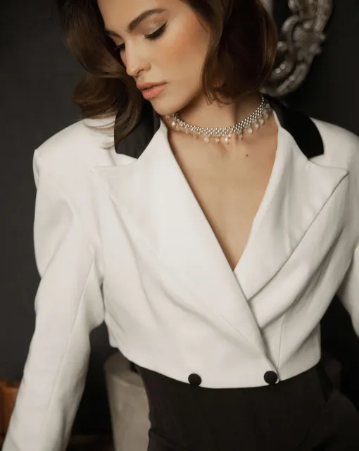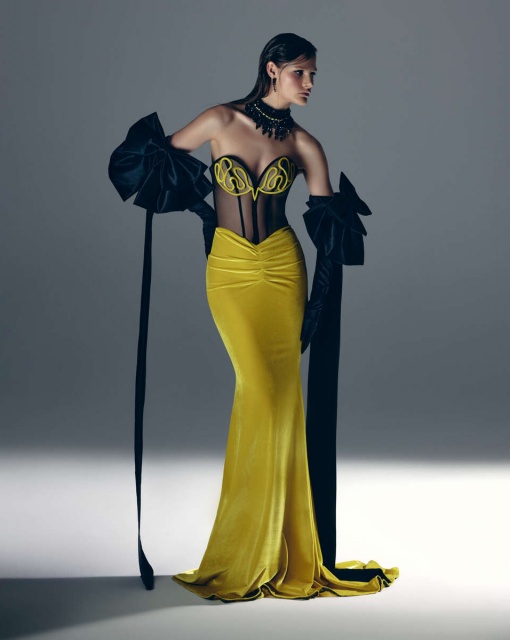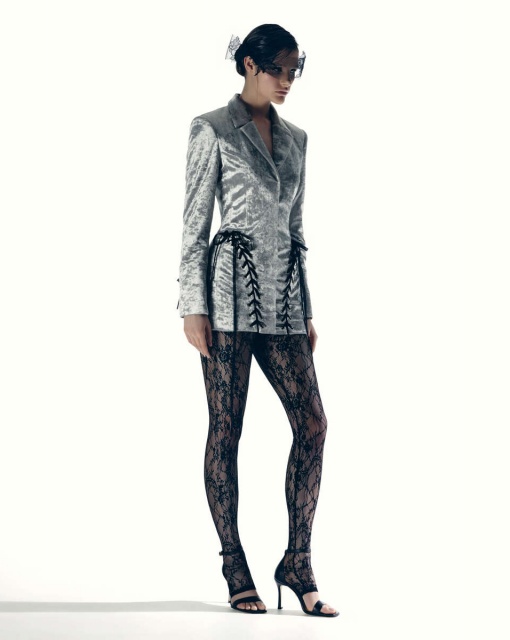 Приталенное короткое платье из кружева и чёрной сетки с креповой сорочкой на тонких бретелях. Декорировано шнуровкой из бархатной ленты спереди и сзади, создавая стильный и загадочный образ.